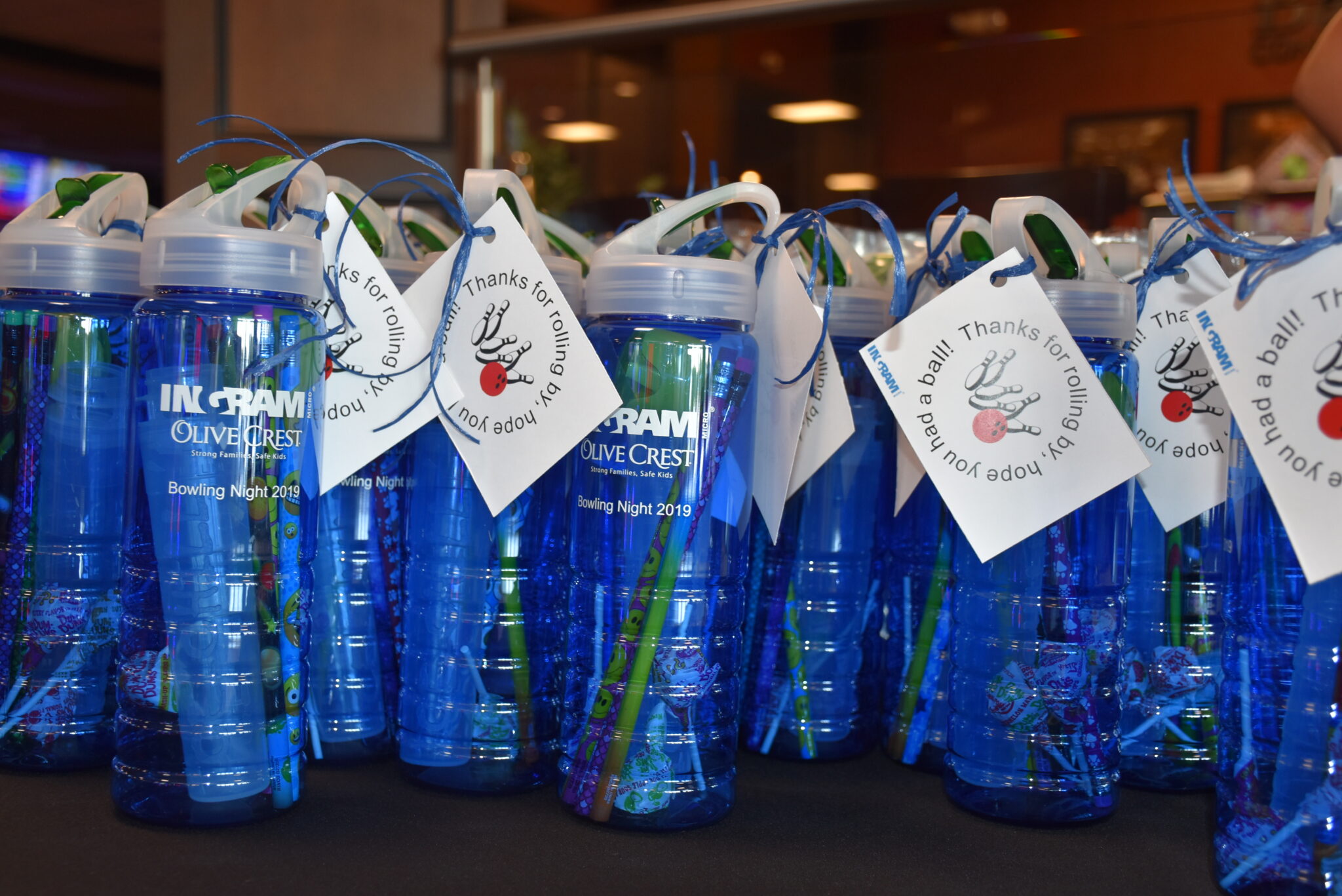 A wonderful evening for all, Olive Crest and 20 Ingram Micro volunteers took over nine lanes that evening. Each family was welcomed by an Ingram Micro volunteer who gave them a customized water bottle, pencils, pencil sharpeners, and candy. They also provided bowling shoes, two hours of bowling, and volunteers to help little ones bowl, along with a splendid dinner of pizza, salad, fruit and drinks. It was an awesome way for Olive Crest families to connect with each other and develop critical relationships within the foster community. Olive Crest Adoptions Supervisor, Jennifer Oei, said, “We truly felt spoiled and we are incredibly grateful for Ingram Micro’s generosity.”