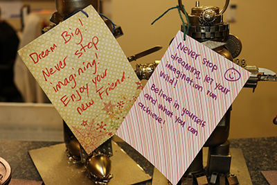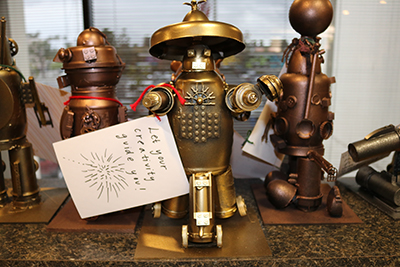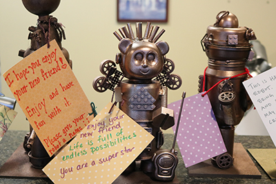 In mid May, Olive Crest in Orange County was invaded by robots! The awe-inspiring metallic creatures, designed by university students working with the Child Creativity Lab, were built from repurposed materials and donated to Olive Crest. Each robot came with a special written message about hope and possibility to help motivate our kids and teens. The Child Creativity Lab encourages hands-on creativity, and we are grateful to them and to the USC students who partnered to delight us with their special creations.